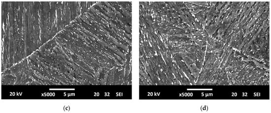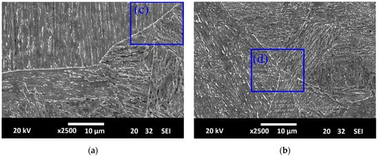 CGHAZ microstructures. (a,c) Real weld: ×2500 and ×5000; (b,d) Simulated weld: ×2500 and ×5000.