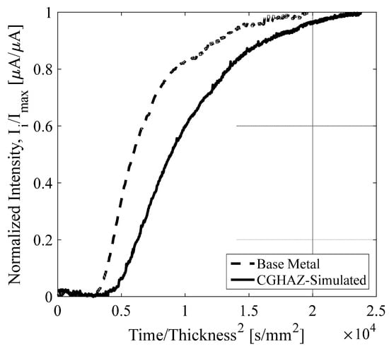 Figure 2 shows the obtained permeation curves (current detected in the anodic cell of the experimental setup) for both the BM and the CGHAZ-simulated microstructures represented in a normalized intensity (intensity divided by maximum intensity value) versus the normalized time (time divided by square of sample thickness) plot. Applying the time lag method to these curves [], Deff was determined and the obtained results are presented in Table 2. It is noted that BM has a hydrogen diffusion coefficient slightly higher than the CGHAZ-simulated microstructure.