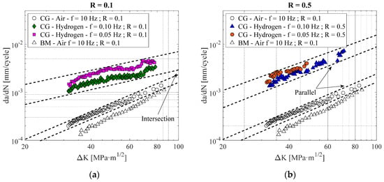 Fatigue crack growth test curves obtained in hydrogen pre-charged CGHAZ-simulated. (a) R = 0.1; (b) R = 0.5.
