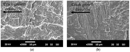 First at all, the fatigue crack growth rate measured in absence of internal hydrogen (empty symbols) on CGHAZ-simulated was significantly higher (1.5–2.0 times greater at all ΔK) than on BM. The coarser microstructure and higher hardness (and strength) of the CGHAZ-simulated microstructure explains this behavior. Nevertheless, this difference was not observed on their fracture surfaces. As shown in Figure 4, the fracture micromechanisms operative in both steel microstructures, characterized by the presence of striation marks, were identical, evidencing considerable plasticity during crack growth due to blunting phenomena. Furthermore, this ductile appearance is in agreement with the microvoids coalescence (MVC) micromechanism observed on the failure surfaces in the fracture toughness tests performed in air on the same microstructures (without hydrogen and hydrogen pre-charged) [].