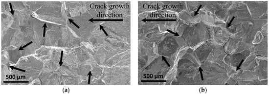 The fatigued surfaces of all these specimens were analyzed under the scanning electron microscope. Figure 5 shows some fracture surfaces of hydrogen pre-charged CGHAZ-simulated specimens with R = 0.1, at the beginning of the test (ΔK = 35 MPa) for the two applied fatigue frequencies. It was noticed that, even under the highest frequency (Figure 5a), the fracture surface of these specimens differed from the uncharged ones. In agreement with the observations of Murakami et al. [] on a similar steel, when these quenched and tempered steels were fatigue tested with internal hydrogen, the crack tip plasticity responsible of fatigue striations was not observed, but the main operative failure micromechanism was in this case bainite lath descohesion (BLD, see insert of Figure 5a), decohesion along the bainite interfaces (microstructural units observed in the insert of Figure 5a have similar size and morphology than bainite laths, Figure 1b,d), which is the same as that which also appears under static loads in fracture tests characterization with internal hydrogen []. Moreover, some areas with intergranular fracture (IG) are also appreciated in the images of Figure 5 (marked with black arrows) with dimensions comparable to the prior austenite grain size present in this microstructure (see Table 2). The presence of these failure micromechanisms supports the strong embrittlement of this microstructure tested under internal hydrogen. When a lower frequency was applied (Figure 5b), a greater fraction of the intergranular fracture micromechanism was observed, in agreement with the larger hydrogen effect shown in the specimens tested at this frequency.