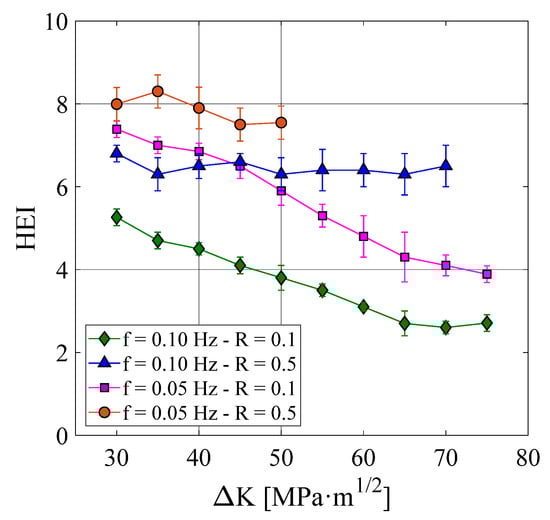 Evolution of the HEI in the fatigue crack growth rate along the different tests.