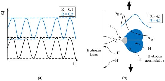 (a) Stress cycles (R = 0.1 and 0.5) with the same Δσ; (b) Hydrostatic stress distribution in front of the crack for R = 0.1 and 0.5.