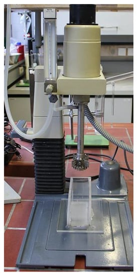 Flotation experiments (1-stage) were conducted in a 125 mL Denver-type flotation machine in an IFAD construction (Figure 1). The collector that was used was ShellSolTM D100 (Shell, London, UK), with C13–C15 paraffins and naphthenes as the main components [31]. An emulsifier (Emulsogen EL, Hoechst, Frankfurt, Germany) was added to the collector in a mass ratio of 1:10 and was diluted to a 1 wt% emulsion for use. MIBC (Sigma-Aldrich, St. Louis, MO, USA) was employed as the frother, the inhibitor was oxalic acid (CARL ROTH, Karlsruhe, Germany), and the dispersant was sodium hexametaphosphate (Riedel-de-Häen, Seelze, Germany). MIBC, oxalic acid, and sodium hexametaphosphate were diluted to a 1 wt% solution for use. The stirring speed was 2000 rpm, and the airflow rate was 40 L/h. The conditioning time was one minute for each reagent, and the flotation scraping time was 5 min.