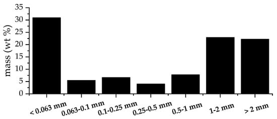 After sieving, the particle size distribution of the BM was obtained, and it is shown in Figure 2. The sieve analysis showed that the main mass fractions were distributed among the sieve classes < 0.063 mm, >2 mm, and 1–2 mm.
