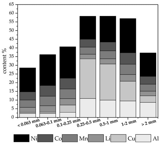 The main metal content in all the fractions is shown in Figure 3. Three size fractions (0.1–0.25 mm, 0.063–0.1 mm, and <0.063 mm) had lower total metal contents than the other fractions. This was probably caused by the increased carbon content in these fine-sized fractions. In addition, the distribution of the aluminum and copper was not homogeneous in the different particle size fractions. In the 0.25–0.5 mm fraction, the Al content was 11%, and the Cu content was 23%, while, in the 0.1–0.25 mm fraction, the Al content decreased to 3%, and the Cu content dropped to 4%. In these three fine-sized fractions (0.1–0.25 mm, 0.063–0.1 mm, and <0.063 mm), the Al and Cu contents were significantly lower than in the coarser fractions.