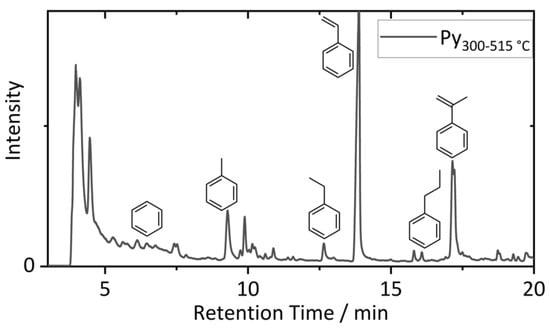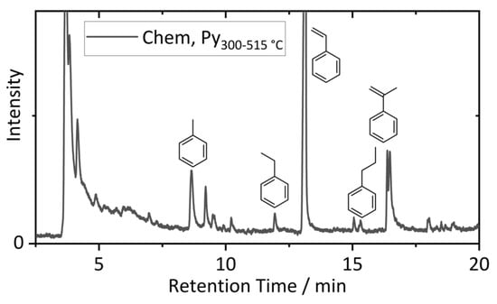 Magnified Py-GC-MS pyrogram (515 °C pyrolysis temperature) of the BM after chemical pretreatment (0.5 M; pH = 3). Characteristic SBR-originating aromatic compounds, such as styrene, are marked.
