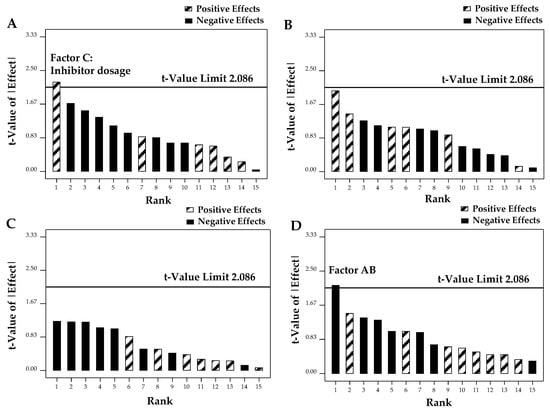 A Pareto chart can be used to determine the essential effects and the magnitude [35]. The length of each bar is proportional to the absolute value of its standardized effects, and the bars are ranked as the size of the effect [35,36,37,38]. The horizontal line refers to a test at p = 0.05 and a t-value = 2.086. A factor is statistically significant when the absolute value of the standardized effect of the factor is above the line [36]. As is shown in Figure 6A, for R1, only the absolute value of the effect of Factor C was slightly higher than the t-value limit. For Responses 2 and 3 (Figure 6B,C), no significant effects were found. For Response 4 (Figure 6D), only the absolute value of the interaction effect of Factor AB was slightly higher than the t-value limit. The omission of some important factors may cause the insignificant effect of nearly all the factors. Considering the results of the SPME-GC-MS and Py-GC-MS, the important omission factor can be the removal level of the electrolyte and the binder.