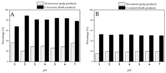At the beginning, the BM was pretreated with 0.1 M of Fenton reagent at different pH values. Afterward, the flotation experiments were carried out. The flotation results (Figure 7A,B) show that the separation of the NMC and the graphite was not significant. For example, the grade of the graphite was about 52%, and the graphite recovery was 81% if the pH was controlled at 3 and 4 during the pretreatment. On the other hand, the recovery of the NMC in the pulp product was around 30%, with an NMC grade of 51% (Ni-content: 19%). The flotation results of almost all of the samples from pH 1 to pH 7 were close to those of the untreated BM (Table 3) (i.e., although the recovery of the graphite in the froth product was high, the grade of the graphite was low because of a large amount of entrapped NMC particles).