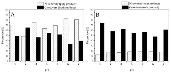 The flotation experiments were also conducted after the BM was pretreated with 0.5 M of Fenton’s reagent at different pH values (Figure 8A,B). The results show that, when the pretreatment pH was 3, the C content in the froth product was 62%, and the graphite recovery was 46%. The recovery of the NMC in the pulp product was 76%, and the NMC grade was 46% (Ni content: 17%). When the pH was 7, the recovery of the NMC in the pulp product was 81%, and the NMC grade was 48% (Ni content: 18%), while the recovery of the graphite in the froth product was 40%, and the C content was 61%. The recovery was relatively close to that of pH 3.