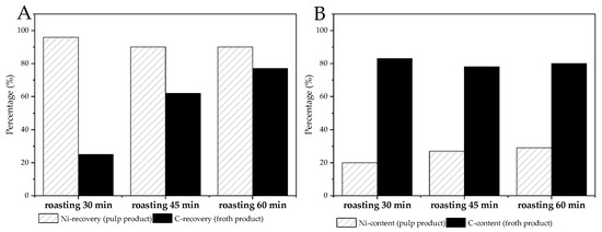 (A) Recoveries and (B) contents of flotation products obtained from the BM after different roasting times.