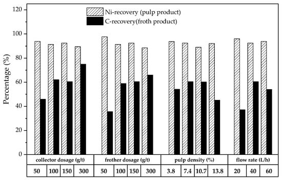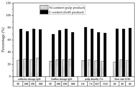 In the end, to optimize the flotation parameters, single-factor experiments were conducted. The BM was then pretreated at 450 °C for 60 min and was soon used for the subsequent flotation experiments. The influences of the individual factors, such as the collector dosage, the frother dosage, the pulp density, and the airflow rate, were investigated, as is shown in Figure 12 and Figure 13. The highest NMC grade (83%) (Ni-content: 31%) was obtained with an NMC recovery of 90% in the pulp product. Moreover, the C content in the froth product, of 77%, was achieved with a graphite recovery of 75% (collector: 300 g/t; frother: 150 g/t; pulp density: 7.4%; airflow rate: 40 L/h). The results show a significant increase in the selectivity after the thermal pretreatment compared to the tests on the untreated BM and the chemically pretreated BM.
