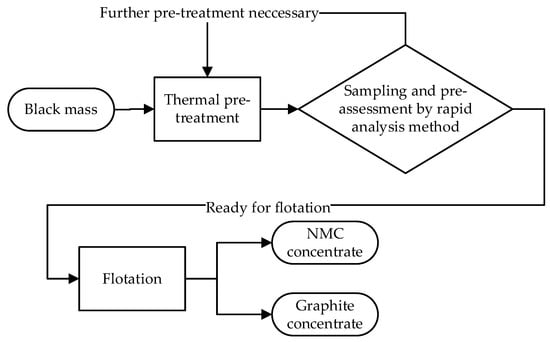 Black mass (BM) refers to the mixture that is detached from the current collector foils during mechanical treatment. It mainly consists of the cathode active material, such as NMC (LiNixMnyCo1−x−yO2) particles, and the anode active material graphite or graphite/silicon composite from spent LIBs. Trying to recover the valuable metals and, in addition, a cleaned graphite fraction flotation, before leaching seems to be a favorable approach, separating the cathode from the anode material for the subsequent individually adapted chemical separation steps. Froth flotation is a conventional technique that is used for enriching and separating different minerals on the basis of the surface hydrophobic differences [22]. Because natural graphite and pure NMC particles have significant wettability differences [2], many researchers currently utilize flotation methods in their studies for the separation of NMC from graphite. However, Zhang et al. found that the surface of the electrode active material particles was covered with organic substances that originated from the used electrolyte in the battery system, which made the wettability difference between the cathode active material and the graphite particle surfaces very similar, which thus reduced the separation efficiency of the flotation [23,24]. On the basis of these findings, chemical or thermal pretreatment steps on the BM should be applied to overcome this problem.