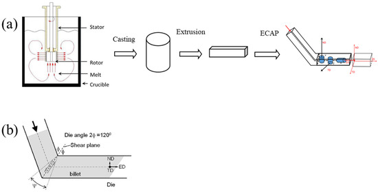 - Xu, Q.; Ma, A.; Saleh, B.; Li, Y.; Yuan, Y.; Jiang, J.; Ni, C. Enhancement of Strength and Ductility of SiCp/AZ91 Composites by RD-ECAP Processing. Mater. Sci. Eng. A 2020, 771, 138579. [Google Scholar] [CrossRef]