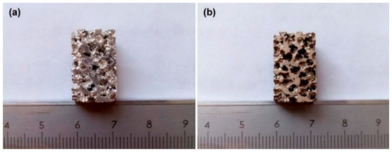 Macroscopic morphologies of (a) AZ91D alloy foams and (b) AZ91D hybrid foams.
