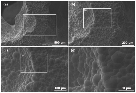 Figure 2 displays the microstructure of the AZ91D hybrid foams. It is clear in Figure 2a that the hybrid foams are completely covered by the composite coatings. High magnifications as shown in Figure 2b,c exhibitthat those composite coatings are continuous, without obvious defects, and their surface exhibits typical nodular morphology. The nodular diameter measured from Figure 2d is in the range of 15–45 μm. Such high-quality composite coatings mainly arise from the MAO layer that provides more depositing sites for nickel.