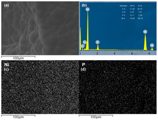 Figure 3 shows the EDS analysis of the surface for the AZ91D hybrid foams. The EDS results demonstrate that the chemical compositions of the surface mainly include Ni and P elements. The content of the P elements is in the range of 6–10 wt.%, indicating that such a coating is a medium phosphorus coating [22]. The element distribution indicates that the Ni and P elements are dispersed without segregation in the coating, while the Mg and Al elements existed in the AZ91D substrate. In addition, the element of the MAO layer is not detected, which confirms that the Ni–P layer is densely deposited on the MAO layer. Owing to the high density of Ni, the density of the foams was increased by about 46%.