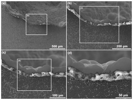 Figure 4 shows the microstructure of the cross-section for the AZ91D hybrid foams. The composite coatings on the cross-section display a double-layer structure, which includes an intermediate layer and a top layer from the substrate to the surface. The intermediate MAO layer is generated from the AZ91D substrate, while the top Ni-P layer grows from the MAO layer. The average thickness of the MAO layer and Ni–P layer is around 25 and 32 μm, respectively. Some micro-pores are also observed in the MAO layer. These micro-pores are mainly ascribed to the micro-arc discharges. During the MAO process, the micro-arc discharges can produce an instantaneous high temperature and then melt the substrate, resulting in the generation of the molten oxide ceramics [23]. Consequently, the MAO layer shows good adhesion with the substrate because it is metallurgically deposited on the metal substrate [24]. It is noted that parts of the Ni–P layer are embedded in the micro-pores of the MAO layer, as displayed in Figure 4d, indicating that the Ni–P layer and MAO layer bond together by mechanical interlocking.
