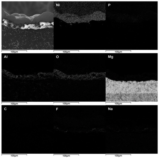 EDS analysis of the cross-section of the AZ91D hybrid foams: SEM image and composition distribution of Ni, P, Al, O, Mg, C, F and Na element.