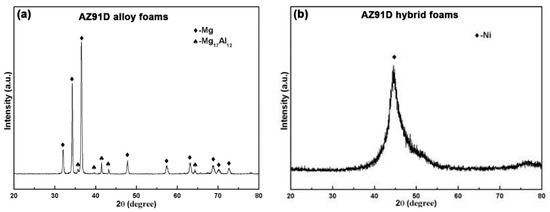 Figure 6 presents the XRD patterns of the AZ91D alloy foams and the AZ91D hybrid foams. From Figure 6a, it can be identified that the AZ91D alloy foams mainly consist of the α-Mg matrix and the β-Mg17Al12 eutectic phase, while the XRD pattern for the AZ91D hybrid foams in Figure 6b illustrates a sharp diffraction peak at around 45°, which corresponds to the diffraction peak of (111) planes of Ni. The peak intensity with a wide region indicates that the Ni–P layer is mainly a mixture of nanocrystalline plus amorphous elements. The absence of other diffraction peaks also confirms strongly that a thick and dense Ni–P top layer of high-quality is deposited on the MAO intermediate layer.
