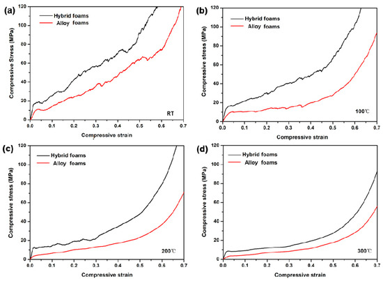 The compressive stress–strain curves of alloy foams and hybrid foams at elevated temperatures: (a) RT; (b) 100 °C; (c) 200 °C; (d) 300 °C.