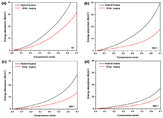 The energy absorption capacities of alloy foams and hybrid foams at: (a) RT; (b) 100 °C; (c) 200 °C; (d) 300 °C.