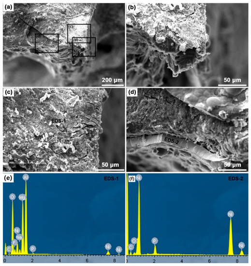The fracture morphologies and EDS analysis of hybrid foams at RT: (a) fracture of the foam struts; (b–d) enlarged picture in the box marked in (a) that showing parts of the foam struts; (e,f) are energy spectra of EDS-1 and EDS-2, respectively.