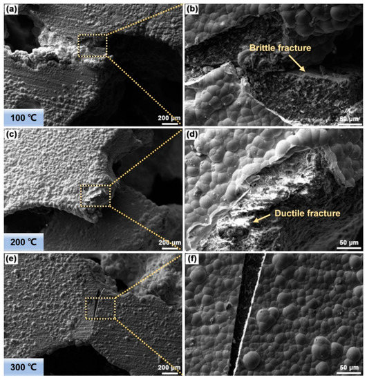 The fracture morphologies of AZ91D hybrid foams at temperatures of (a) 100 °C, (c) 200 °C and (e) 300 °C; (b,d,f) are high magnification images for (a,c,e), respectively.