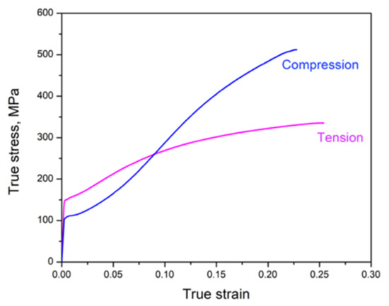 For the as-extruded ZX20 alloy, a tension–compression (T-C) asymmetric behavior [30,31,32] is observed. As shown in Figure 2, the stress–strain curve obtained from tensile tests along the extrusion direction (ED) differs strongly from that obtained from compressive tests along the ED. The tensile yield strength (TYS ≈ 150 MPa) was higher than the compressive yield strength (CTS ≈ 100 MPa). Yet, the stress level during the compression test increased rapidly after 2% strain, and the ultimate compressive strength (UCS ≈ 500 MPa) was much higher than the ultimate tensile strength (UTS ≈ 300 MPa).