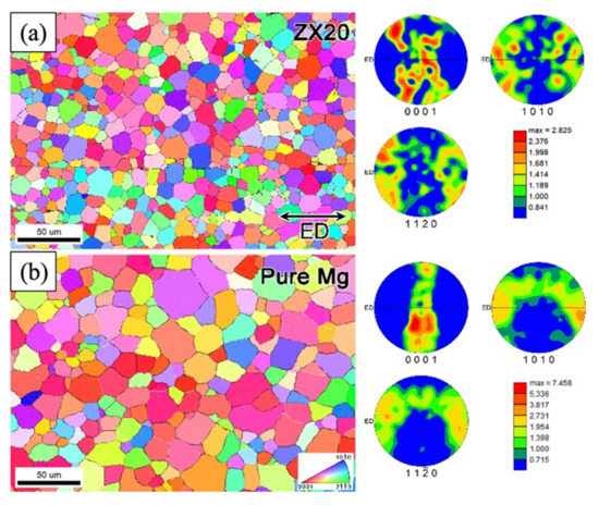 Inverse pole figure (IPF) maps and pole figures (PFs) of (a) ZX20 and (b) pure Mg. The colors in the IPF maps represent the grain orientations with respect to the extrusion direction (adapted from [28]).