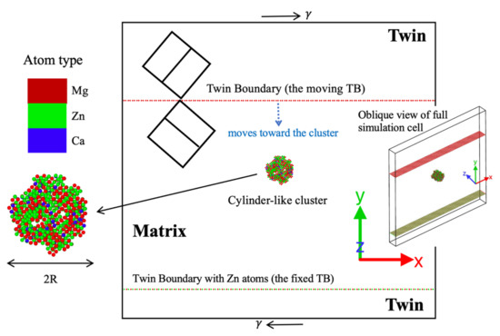 The MD sample illustrated in Figure 4 contained 821,530 atoms, having dimensions of 55 nm × 52 nm × 4.5 nm. A pair of TBs at a separation distance of 32 nm were introduced within the MD supercell under three-dimensional (3D) periodic boundary conditions. The lower TB was fixed by periodically replacing Mg atoms at compression GB sites with Zn atoms such that the interaction with the cluster only involved the upper TB (the TB moving toward the cluster) [8]. To avoid additional size effects in 3D, the shapes of clusters were chosen to be cylindrical with length equal to that of the MD box in the Z direction. The cluster size was measured by the radius R of the circular cross-section. Clusters containing different Zn and Ca contents were produced by randomly replacing Mg atoms by Zn and Ca atoms at a certain Zn/Ca ratio in the cluster domain.