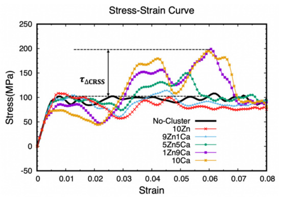 To clarify how cluster-hardening effects depend on the Zn/Ca ratio, a set of clusters with fixed radius R = 2.5 nm were considered. The corresponding stress–strain curves obtained by MD simulations are shown in Figure 5. The cluster-free case is taken as a reference for comparison. Due to the X–Y deformation in current simulations, the shear stress is computed as the sum value of the per-atom in the MD supercell, while the shear strain is defined as , where is the displacement distance in the X direction from the unstrained orientation and is the box length in the Y direction. It is worth noting that since twinning is the only mode of plastic deformation due to the absence of lattice dislocations or other defects, the yield stress defines the critical resolved shear stress (CRSS) for TB migration [43,44].