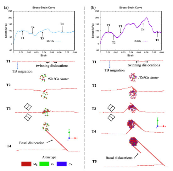 The interactions between a migrating TB and two clusters in different Zn/Ca ratios, 9Zn1Ca and 1Zn9Ca, are depicted in Figure 6a,b. After the onset of plastic yielding, the TB starts migrating towards the cluster by the glide of twinning dislocations, as shown for the T1 step in Figure 6, in agreement with previous MD simulations [45].