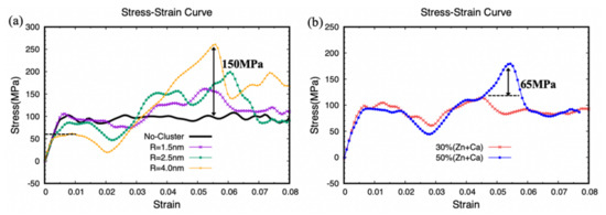 Moreover, comparing the stress–strain curves for the 9Zn1Ca cluster with R = 2.5 nm (Figure 6a) and the 1Zn9Ca cluster with R = 1.5 nm (Figure 7a) suggests that the latter exhibits a more pronounced hardening effect. Therefore, the element content is regarded to play a more significant role than the cluster size in terms of hardening.