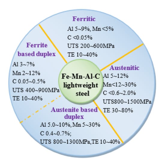 The automobile is the product of modern civilization and one of the main means of transportation. With the intensification of the global energy crisis and environmental degradation, automobile energy consumption and exhaust emissions have attracted extensive attention. It is found that vehicle weight reduction can reduce energy consumption. Al can significantly reduce the density of steel. Adding 1 wt.% Al to the steel, the quality of the steel is reduced by 1.5% [1,2]. Among the materials used in vehicles, steel materials account for about 70% of the vehicle weight, so lightweight steel has attracted much attention in the automotive manufacturing industry. In the 14th Five Year Plan, China clearly proposes to develop the automobile strategic industry and reduce the carbon emission intensity, and formulates the carbon emission peak plan by 2030 years. Therefore, research on lightweight steel has become a strategic need for national economic construction and environmental protection. Fe-Mn-Al-C lightweight steel has the characteristics of high strength at room temperature and low temperature, good oxidation resistance at high temperature, good fatigue performance, high elongation, and good energy absorption during a collision, etc., [3,4,5,6,7,8,9]. According to relative contents of alloying elements (such as Al, C, and Mn) and matrix phases at high (hot working) temperatures, the Fe-Mn-Al-C lightweight steels are divided into three categories, ferritic lightweight steels, duplex lightweight steels (ferrite based duplex lightweight steels and austenite based duplex lightweight steels) and austenitic lightweight steels (see Figure 1). During the cooling process of austenitic lightweight steels, intragranular κ-carbides ((Fe,Mn)3AlC precipitation and intergranular κ-carbides ((Fe,Mn)3AlC) precipitation will be produced. The κ-carbides as the main precipitate in Fe-Mn-Al-C austenite lightweight steels, the morphology, size, and distribution is directly related to the properties of lightweight steels. By adjusting heat treatment process parameters, nanometer κ-carbides can be dispersed in grains, so as to improve the comprehensive properties of lightweight steels. In order to further improve the comprehensive properties of lightweight steels, strengthening mechanisms such as grain refinement and precipitation strengthening are adopted, that is, micro-alloyed/alloyed elements are added to lightweight steels [10,11,12,13].