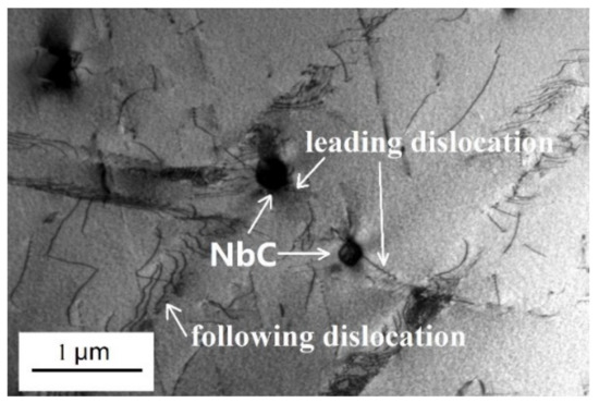 The corrosion resistance of Fe-28Mn-10Al-1C steel in 3.5%NaCl solution was improved, owing to the addition of Nb to Fe-28Mn-10Al-1C steel, that is, increasing corrosion potential and polarization resistance, decreasing corrosion current density [17]. Ma et al. [18] studied the addition of 0.5% Nb to Fe-28Mn-10Al-1C austenitic lightweight steel, the austenite grain size decreased from 39.49 μm to 13.67 μm. Meanwhile, the yield strength, ultimate tensile strength, and elongation were increased by 171 MPa, 64 MPa, and 11.5%, respectively. The strength and ductility of the steel were well balanced. The precipitation of NbC inhibits dislocation slip (see Figure 2), which will enhance the precipitation strengthening effect and improve the strain hardening rate. In addition, Nb can increase the stacking fault energy of lightweight steel. However, the deformation mechanism and strengthening mechanism of steel have not changed.