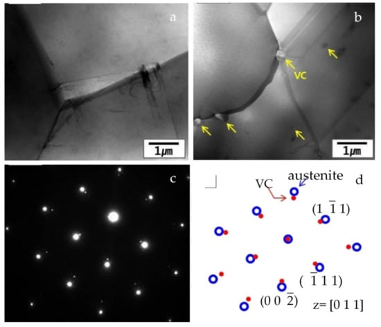 TEM micrographs of base steels (a) bright field image of steel 0 V, (b) bright field image of steel 0.5 V, (c) SAD pattern with Z = [011] and (d) computer simulated SAD pattern [23].