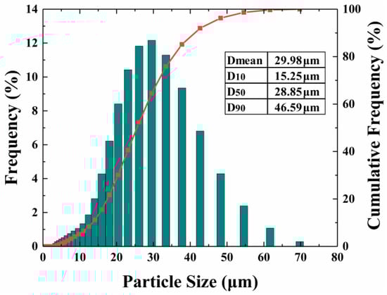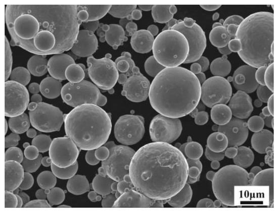 The CuCrZr powder produced by gas atomisation was used in the SLM manufacturing process, and the chemical composition is shown in Table 1. The size distribution of CuCrZr powder was measured by Mastersizer (S3500, Microtrac, Osaka, Japan), its particle size distribution ranged from 15.25 µm (D10) to 46.59 µm (D90), with an average particle size of 29.98 µm, as shown in Figure 1. A SU5000 (Hitachi, Tokyo, Japan) SEM was used to characterise the microstructure of the CuCrZr powder and observe the fracture morphology of tensile parts. Figure 2 shows the microstructure of the CuCrZr powder. Most of the powder particles are spherical or nearly spherical, with a smooth surface and good fluidity that is beneficial to the flatness of the powder layer to ensure the formation of SLM. A small part of the powder particles presents irregular shapes, and the small powder particles are adsorbed around the large powder particles. EP-M150 (E-PLUS 3D, Beijing, China) equipment was used to process CuCrZr alloy samples. It is equipped with a 500 W Yb: YAG laser with a wavelength of 1064 nm and a spot size of 70 μm with a Gaussian distribution. To reduce the temperature gradient, the substrate preheating temperature was 100 °C, the powder layer thickness was 30 μm, and a scanning strategy of 67° rotation per layer was adopted. During the printing process, the oxygen content of the moulding chamber was less than 0.02% and protected by argon gas.