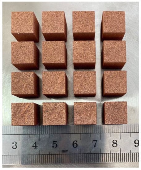 Since there are many factors affecting the forming quality of SLM, it will be a heavy workload to carry out research in full factor mode. Therefore, this experiment adopts a 3-factor 4-level orthogonal test method []. The three factors selected in this paper are laser power, scanning speed and hatching distance, mainly because these three factors have great influence on forming quality when the same SLM equipment prepares parts. In order to avoid large workload and more reliable test results, Taguchi L16 was used to generate general results which have four levels for each factor. The process parameters used are shown in Table 2. In this experiment, an orthogonal test was used to prepare the CuCrZr sample with a size of 10 mm × 10 mm × 10 mm, as shown in Figure 3.