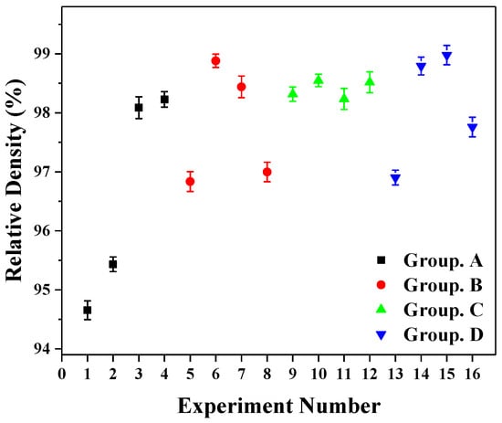 In order to ensure the accuracy of relative density calculation, no less than 20 optical images were collected for each sample. After removing the highest and lowest values, the average value was taken as the final result. Figure 4 shows the relative density measurement results and statistical errors of volume fraction of the pores driven from the image analysis of 16 samples manufactured by SLM. It is obvious from Figure 4 that when laser power is 240 W, scanning speed and hatching distance have little influence on relative density. The relative density of sample No. 15 is the highest, reaching 98.98%. This is mainly because at this process parameter, there is enough energy to completely melt the powder and enough time for the gas inside the powder bed to escape, etc.