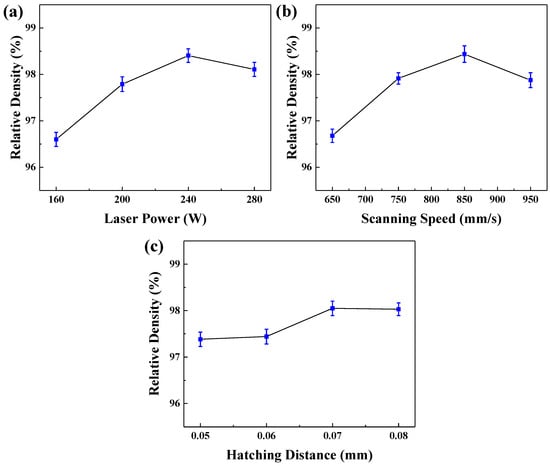 The influence of process parameters on the relative density of samples: (a) Laser Power, (b) Scanning Speed, (c) Hatching Distance.