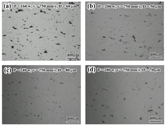 Figure 5 is the main effect diagram of alloy relative density under various process parameters obtained through orthogonal analysis. Figure 5a shows that when the laser power is increased from 160 W to 280 W, the compactness of the samples first shows a trend of increasing, then decreasing. When the laser power is too low, the energy absorbed by the powder becomes too low to be completely melted, the viscosity of the melt becomes higher and the fluidity becomes poor, resulting in poor lap quality between the melt channels and poor continuity of the melt channels. In addition, there are more irregular pores in the sample where the powder is not completely fused, resulting in a low relative density of the sample. When the laser power is 200 W, the sample relative density is significantly improved, as shown in Figure 6a,b. When the laser power rises to 280 W, the powder absorbs so much energy that the melt begins to evaporate. Fast expansion of vapor leads to explosions in the boiling melt []. The splashed particles adhere to the surface of the sample and cause a poor weld lap. Excessive laser power can cause spheroidisation and even burn. In addition, a large amount of molten metal evaporates, resulting in many circular pores on the surface of the sample, thereby reducing the relative density of the sample. When the laser power is high, the solidification time of the molten pool is prolonged, the hydrogen in the molten pool reaches the local solubility limit and nucleation generates bubbles. The bubbles diffuse from the bottom of the molten pool and the heat-affected zone to the top and eventually form many hydrogen holes, so the hole defects are obvious [,], as shown in Figure 6c,d.
