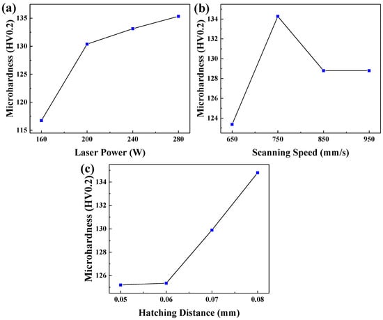 The influence of process parameters on the hardness of samples: (a) Laser Power, (b) Scanning Speed, (c) Hatching Distance.