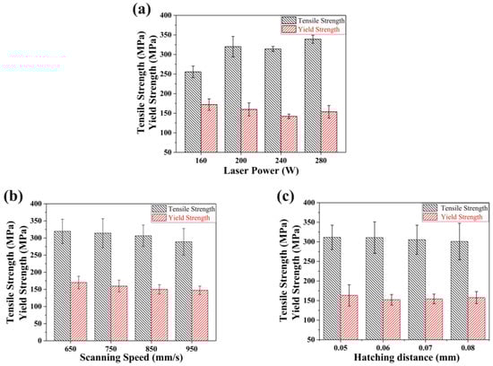 The influence of process parameters on the tensile properties of samples: (a) Laser Power, (b) Scanning Speed, (c) Hatching Distance.