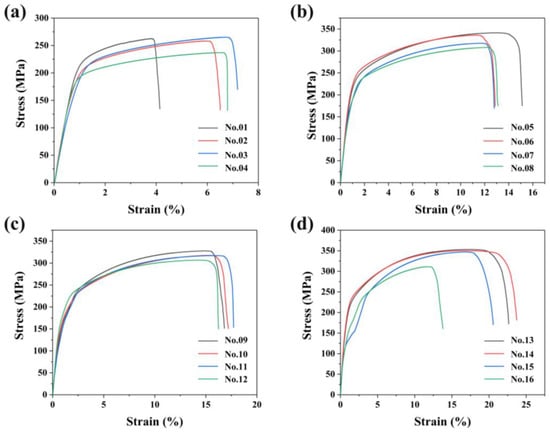 Stress–strain curve of CuCrZr alloy fabricated by SLM under different process parameters. (a) Group A, (b) Group B, (c) Group C, (d) Group D.