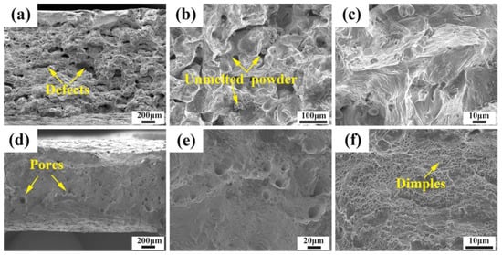 Figure 10 shows a typical SEM image of the fracture of the CuCrZr alloy tensile sample. Figure 10a–c show the fracture morphologies of sample No. 4 at low-magnification and high-magnification, respectively. Figure 10a shows the poor metallurgical bonding of sample No. 4 with many large irregular sizes defects on the surface of the tensile fracture. There are many unmelted spherical powder particles in the interior and peripheral areas of the pores, as shown in Figure 10b. Figure 10d–f are the low-magnification and high-magnification fracture morphologies of Sample No. 14, respectively. The tensile fracture shows an obvious necking phenomenon, and many micron-scale dimples appear, showing the characteristics of ductile fracture. The structure shows that an increase in laser power can significantly increase the tensile strength of the sample and significantly increase ductility.