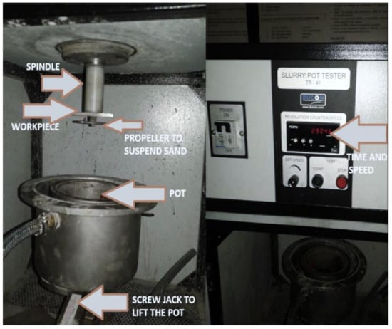 A slurry erosion pot tester (Ducom: TR-401, Banglore, India) was used to perform the slurry erosion wear experiments. The schematic diagram of the slurry erosion pot tester is depicted in Figure 1. It consists of a cylindrical container which is known as a pot, a rotating spindle and a screwed jaw. The capacity of the pot was about 2000 mL, which was used for pouring the slurry into it for performing slurry tests. A mark is made inside the cylindrical pot. The slurry is filled into the pot up to that mark so that the test specimen is completely dipped into the slurry for the accurate results of erosion tests. A screw jack is used for the height adjustments of the cylindrical pot and also used for the loading and unloading of the pot during experimentation. An impeller was fixed at the bottom of the spindle with screw threads which helps in the complete movement of slurry particles and also helps in the prevention of slurry settling at the bottom of the pot during experimentation. The test specimen is tightened horizontally, i.e., at a 0º impact angle in the spindle with the help of the impeller so that the test specimen and the impeller both rotate at the same speed. The mass of the test specimen was measured before and after the erosion experiment and the change in mass was considered as the loss of eroded material. The mass loss measurements were performed with the use of an electronic micro-balancer having the least count of 0.0001 gm. For the mass loss measurements of the test specimen, it was completely washed with acetone and dried for some time and a reading is noted during each cycle.