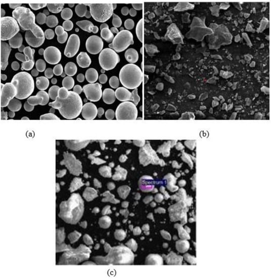 The high-velocity oxy-fuel (HVOF) system was used for the deposition of different combinations of coating powders of Nickel (Ni), Chromium oxide (Cr2O3) and Yttrium oxide (Y2O3) on the substrate material SS-420 at Harsha Welding and Coatings Private Limited, Panchkula, Haryana (India). The particle size of all the powder was less than 40 µm. Scanning Electron Microscopy (SEM) analysis of the powder was performed to verify the purity of the powder to be used in the coating. The analysis of the SEM results highlights that the coating powder was almost 100% pure. The SEM image of the powder is shown in Figure 3. These powders were used to study and analyze the tribological behavior of SS-420. Before the deposition of coating powders on SS-420 specimens, these specimens were cleaned with acetone to obtain the appropriate deposition thickness of coating powders on the specimens. The surfaces of the substrate specimens were blasted by using sand or abrasive particles before the deposition of coating powders which helped in improving the strength between the surface of the substrate specimen and the coating layer. The process parameters of the HVOF spraying technique during the deposition process are listed in Table 2. Process parameters remained constant for the deposition of all coating powders on the substrate specimens. After deposition of coating powders, compressed air was used for the cooling of specimens. The Microhardness and roughness of values of the base materials with the coating are shown in Table 3.