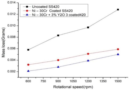 Rotational speed significantly affects the erosion wear on the surface of the coated and non-coated samples and to determine its effect, the experiment was performed at a rotational speed of 600, 900, 1200 and 1500 rpm. All other parameters remain constant so that only the effect of rotational speed can be observed. Other parameters were taken as the time duration for the experiment was 200 min, the concentration of solids was 50% and the particle size of fly ash was 150–250 µm. A graph of the erosion wear is shown in Figure 5. It was observed that Ni − 30Cr + 3% Y2O3 gives the best erosion wear resistance as compared to Ni − 30Cr and uncoated SS-420. It is because the solid particles gain high momentum which in turn gets transferred to the specimen under pot slurry conditions and similar results have been found by other investigators [,,] who depict that a surge in rotational speed increases erosion wear.