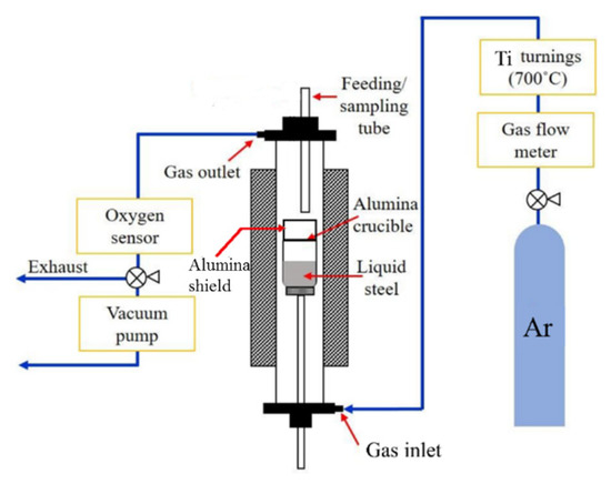 The high-temperature experimental setup is shown in Figure 1. In total, 0.3 g graphite rod, 6.5 g Mn, electrolytic Fe, and an appropriate amount of FeS depending on the targeted S content were placed inside an Al2O3 crucible at room temperature and then heated in the vertical tube furnace to 1873 K and held for 10 min to homogenize the melt. Throughout the experiment, 99.999% Ar gas was fed into the furnace at a rate of 0.5 L/min to maintain a protective atmosphere. After that, Al and Si were added to deoxidize the steel melt. The melt was homogenized for an additional 15 min after deoxidation. Thereafter, Ca was added. The Ca addition technique was adopted from Verma et al. [3]. A mixture of electrolytic Fe and Ca enclosed in a capsule of steel shim was guided to the crucible. It helped Ca to immerse into the melt and increased the recovery rate. The total mass of raw materials was approximately 500 g.